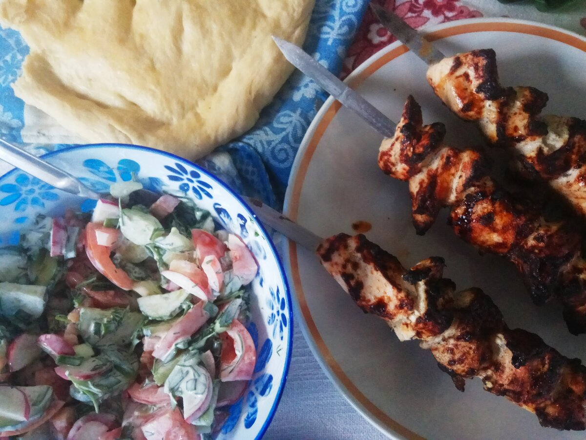 Сегодня я расскажу, как мы жарим шашлыки, которыми можно объедаться и не переживать за фигуру. Как же прекрасно отведать сочного шашлыка вприкуску с хрустящим лавашом! Итак, начнем, готовим продукты: для лаваша Маринуем мясо. Нарезаем филе, лук и чеснок. Смешиваем все ингредиенты в глубокой емкости. Добавляем одну столовую ложку соли, одну чайную ложку черного молотого перца. Убираем в холодильник на пару часов, а пока готовим лаваш. Ставим опару: смешиваем дрожжи, сахар, один стакан муки и два стакана теплой воды. Накрываем полотенцем и оставляем на 1 час! Вот так выглядит опара через час: Всыпаем всю муку, добавляем соль и 3 столовые ложки растительного масла. Замешиваем тесто, месить нужно как можно дольше, в идеале минут 10. Должно получится воздушное эластичное тесто. Убираем в теплое место еще на 1 час. Тесто должно увеличится в 3 раза. Делим тесто на 3 равные части. Выкладываем в противень одну часть. В отдельной миске смешиваем ложку растительного масла и яйцо. Обмакивае