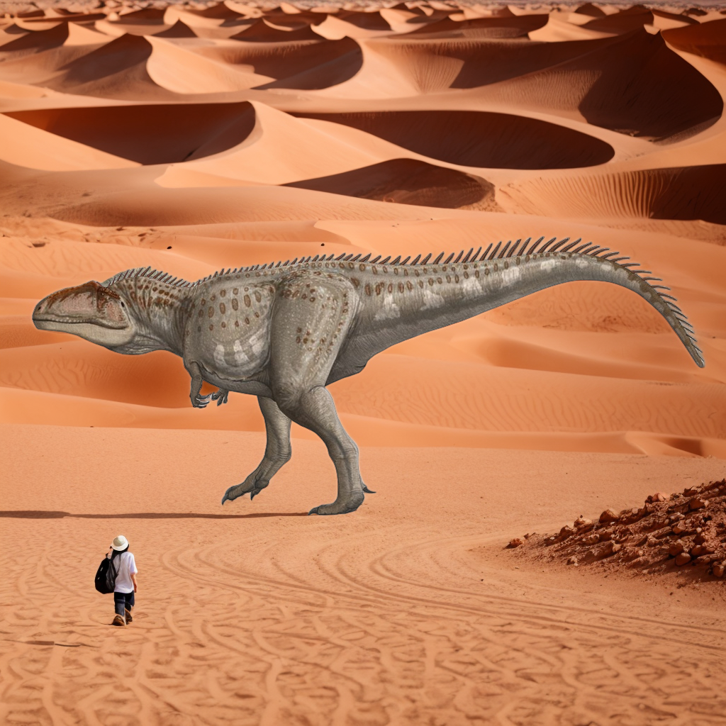Не Ти-рекс, но тоже один из крупнейших хищников. Жил он на много раньше - около 100-90 млн. лет назад, так что они не могли встретиться. А вот со спинозавром могли. Хотя, опять же, спинозавр был привязан к воде, а гига - нет. Размеры он имел под стать Тираннозавру. 12-13 метров длины, по некоторым оценкам весить мог до 10 тонн, что превосходит оценочный вес тираннозавра. Думаю, все они весили меньше, потому что с таким весом довольно тяжело передвигаться. Или гравитационные силы тогда отличались от современных. Почему? Ну давайте посмотрим на слона. Он весит до 7 тонн, но при этом у него 4 опорные ноги, а передвигается он достаточно медленно. Конечно, когда надо, он может быстро бежать, нести разрушение, но на четырех ногах легче. А тут всего две и целых 10 тонн. На самом деле, я не отрицаю возможности того, что сухопутные ящеры имели в весе десятки тонн, я лишь призываю к рассуждениям, здравому смыслу. Вообще, гиганотозавр переводится на русский язык, как "гигантский южный ящер". Это