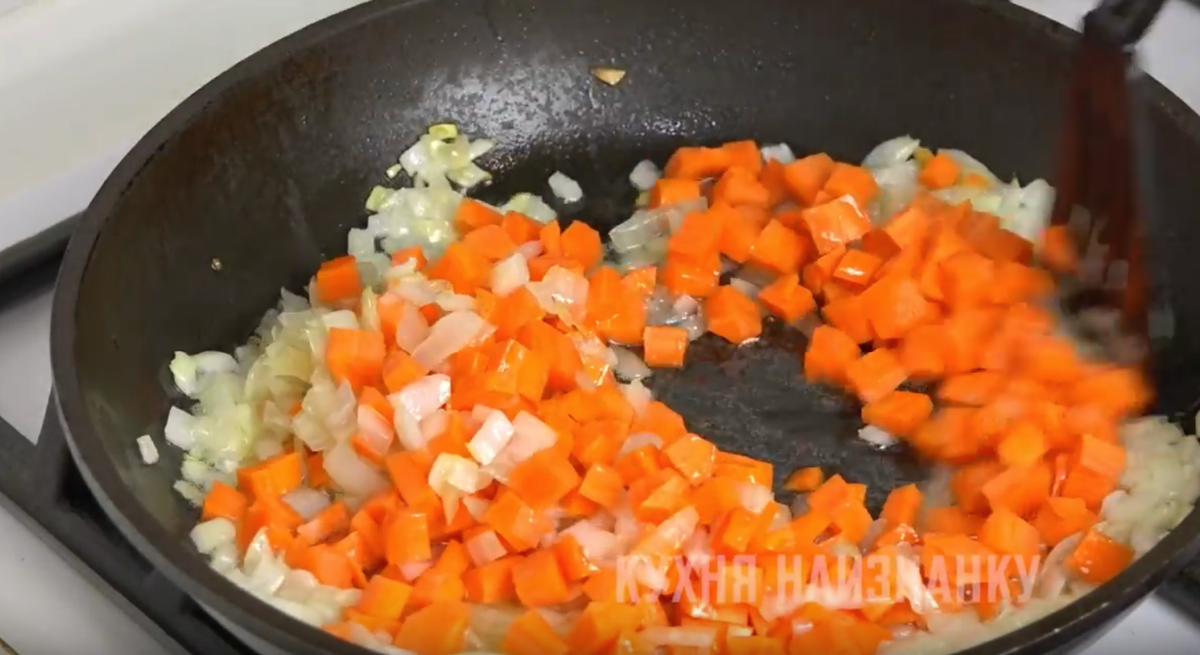 На небольшом количестве растительного масла обжариваю лук до прозрачности и морковь. Жарю минут 5-7. Морковь нарезаю на небольшие кубики.