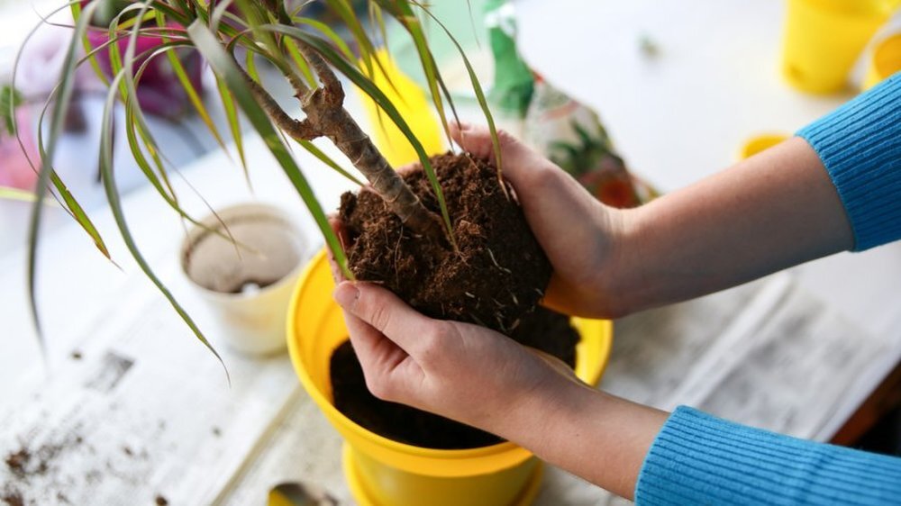 Цветок перестал расти, начали желтеть листья, земля очень быстро пересыхает, нужны частые поливы, корни почти над землёй и если хорошо присмотреться то можно их увидеть. В таких случаях срочно нужна пересадка растений в другой новый горшок. Перед тем как пересаживать в новый горшок и в старый нужно обязательно его вымыть с внутренней стороны и снаружи и просушить. Перед тем как засыпать землю в горшок тщательно её нужно проверить на отсутствие посторонних предметов. На дне горшка обязательно должно быть отверстие для стока лишней воды, чтобы вода не застаивалась в горшке. В начале кладут любой дренаж, а затем засыпают определённый грунт, смесь которого должна подходить для каждого цветка разная, состав земли бывает разный. Если цветок быстро растёт и зелёная масса его, значит и корни заполняют весь горшок, почти в горшке не бывает земли, при этом происходит истощение почвы, вымывается когда поливаем, беднеет питательными веществами земля и растение уже не растёт, выглядит истощ