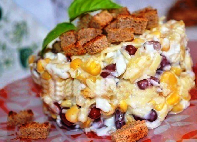 3. Перед подачей перекладываем салат в салатник и посыпаем приготовленными сухариками. Чтобы вид салата был более презентабельным, можно воспользоваться кулинарным кольцом.