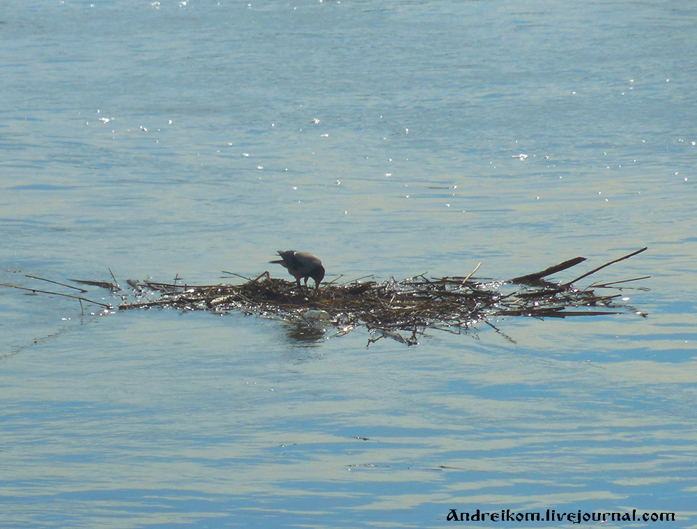 А на дамбе то как хорошо! Вот ворона отправилась в путь на плотике