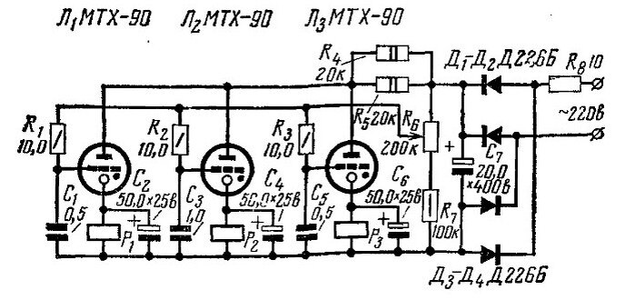 Однако, для полноты картины, нужно сказать, что оригинальная схема (картинки не нашел, но помню, что в старых журналах видел, очень давно) была предназначена для напряжения 127В (использовалось примерно до середины 60-х годов прошлого века в СССР, потом был плавный переход на 220В). А это дает напряжение на конденсаторе С3 как раз 150В. МТХ-90 был доступен уже в 50-е годы прошлого века. То есть, тут ошибку допустили те, кто впоследствии скопировал схему. Так же, возможен вариант, что эта схема разработана не в СССР, а за рубежом (была такая рубрика в журналах), так как никаких претензий не возникает при ее питании от напряжения 110 В (стандартное напряжение в США).