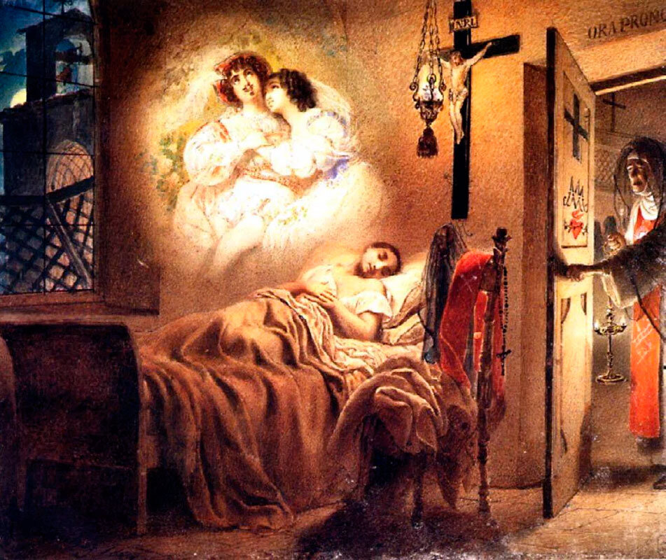 Об этом и рассказывает картина Карла Брюллова "Сон монашенки" Картина написана в 1831 году, во время первого пребывания Брюллова в Италии. Еще не созданы самые знаменитые полотна, художник пока не слишком известен. Он пока еще постигает науку, поэтому все выписывает с точностью и по традиционным правилам. За окном – синяя глубокая ночь. В келье спит молодая монашка. В изголовье – распятие, над головой висит горящая лампада. На стуле небрежно брошена одежда. Монашка молода и неопытна. Она еще не пропитана строгим порядком монастыря. Дверь приоткрыта, в нее заглядывает смотрительница. Вот она уже все знает о жизни за монастырскими стенами. О чем она думает? О том, что и сама была молодой? Жалеет девушку, которая по чьей-то воле (а, может, и по своему желанию) оказалась спрятана от светской жизни? Через мгновение она притворит дверь, оставив молодую монашку со своими грезами. А грезы девушки ничем не отличаются от грез девушек её возраста. Ей снится любовная сцена. Молодой чело