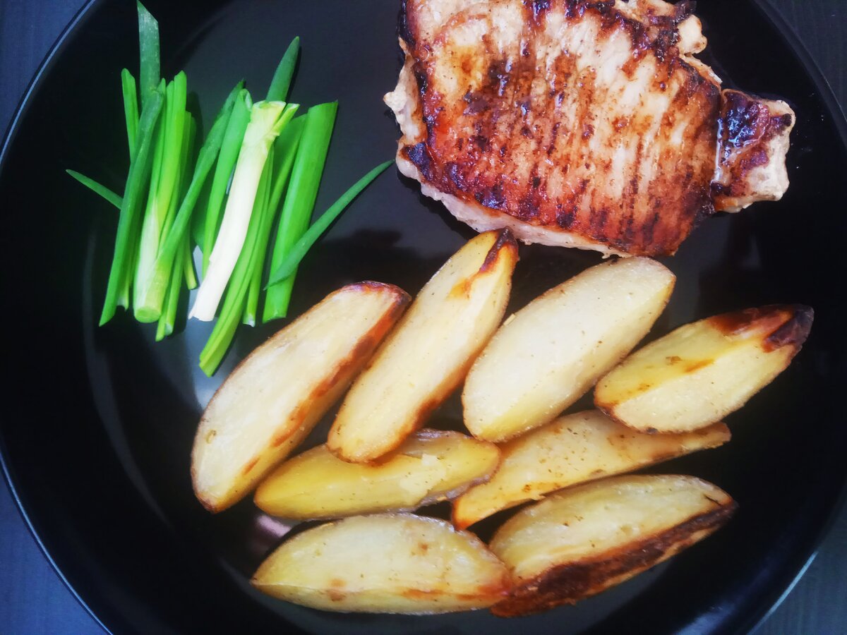 Сегодня на ужин готовим жаренное на гриле мясо свинины. Я выбрала карбонад, эта часть свинины по праву считается диетической, поскольку практически не имеет жира. Но почти полное отсутствие жировой прослойки делает карбонад достаточно капризным в приготовлении- его очень легко пересушить, сделав похожим на подошву. Я расскажу, как добиваюсь нежной, мягкой структуры мяса при зажаривании. На гарнир готовим запеченный картофель по-деревенски, что сохраняет его максимальную пользу для организма. Итак, для начала готовим ингредиенты: Весь секрет сочного мяса в том, что я заранее вымачиваю его минеральной воде. Карбонад нарезаем ломтиками толщиной 1,5-2 сантиметра. Складываем мясо в глубокий контейнер и заливаем минералкой. Все! Убираем в холодильник на ночь. На следующей день достаем мясо из холодильника. Оно хорошо напиталось и размягчилось. Вынимаем мясо из минералки и оставляем при комнатной температуре, а пока займемся гарниром. Картофель моем и нарезаем дольками. В глубокой емк