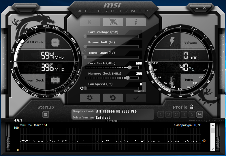Как я заставил стабильно работать видеокарт Radeon HD 2600 Pro на своём системном блоке?! По совету моего друга я переустановил видеокарту, вместо Gefoce HD 8600 Pro на видеокарту Radeon HD 2600 Pro. В начале вроде было всё в норме, но со временим появились проблемы: впеменами гас экран монитора, или вовсе ОС зависала-приходилось перезагружать через аварийку. Что конечно это неудобно. Принялся искать в интернете ответы на это явление. И случайно наткнулся на эту программу: MSIAfterburnerSetup230. Стал её внимательно изучать, как на сайтах и по видео на yuotube. Короче говоря решил установить её. Нашёл подходящий сайт, предлагающий скачать на 64bit версию. Так как на моём системном блоке установлена 64 bit ОС windows 10 Pro, -скачал и установил. Но не стал в ней ничего изменять, т.к. изначально работает в автономном режиме. И решил подождать поведение этого приложения. И что думайте, ке моему удивлению все ранние проблемы: погасание экрана монитора и зависания ОС исчезли,как будто
