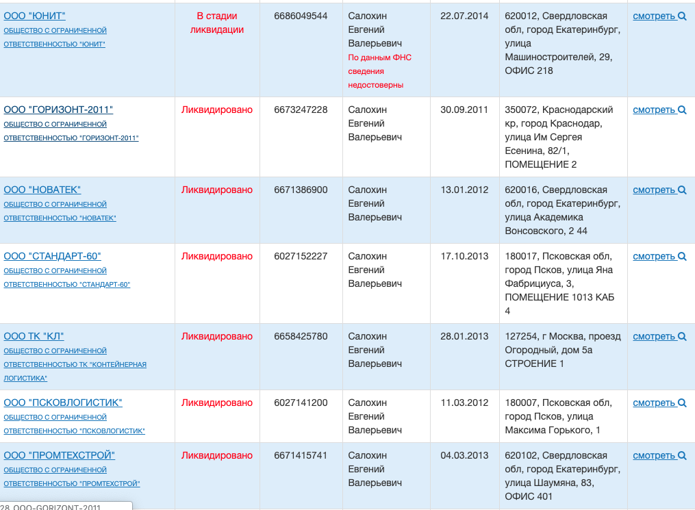 В истории с берёзовой рощей есть явные организаторы (Екатерина Сапрыкина), тайные консультанты (предположительно, депутат-уголовник Максим Петлин) и пешки-исполнители. Одним из таких исполнителей является некий Евгений Валерьевич Салохин. Как известно из СМИ, именно он подал заявление в прокуратуру в связи с деятельностью "Атомстройкомплекса" в Краснолесье. Давайте посмотрим повнимательнее на этого персонажа. Начнём с банального поиска по Яндексу. И обнаружим, что он является директором 44 коммерческих организаций и руководителем ещё 36 компаний. Большая часть из них обанкротилась или прекратила свою деятельность по иным причинам. Очевидно, что такое количество подконтрольных структур может быть или у крупного предпринимателя (явно не наш случай), или у номинального (фиктивного) руководителя. То есть какие-то деятели неоднократно нанимали господина Салохина для создания фирм-однодневок и фиктивного руководства ими. Такого рода компании обычно используются не очень чистоплотными людьми