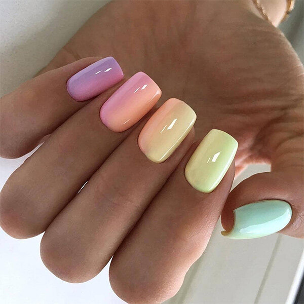 Градиент, омбре, радужный маникюр - все это название одного и того же дизайна, где один цвет плавно перетекает в другой. За десятки лет существования у этого дизайна появилось много вариантов исполнения: Обычно градиент на ноготках выполняется специальным инструментом - аэрографом. Он распыляет гель-лак по ноготкам, и переход одного цвета в другой получается плавным и аккуратным. При выполнении вручную такой плавности может не получиться. Но многие мастера приспособились и научились делать омбре с помощью подручных средств: некоторые используют губку, а некоторые растушевывают широкой кистью. Не забудьте поставить лайк, если вам понравится статья. Приятного просмотра! 1. Нежный градиент - весенние варианты Весной, когда природа только просыпается, используйте для омбре светлые, нежные оттенки: молочный, бежевый, сиреневый, розовый, персиковый, небесный голубой и др. Матовые варианты омбре смотрятся очень спокойно и стильно: 2. Яркий градиент - сочные летние оттенки Лето - солне