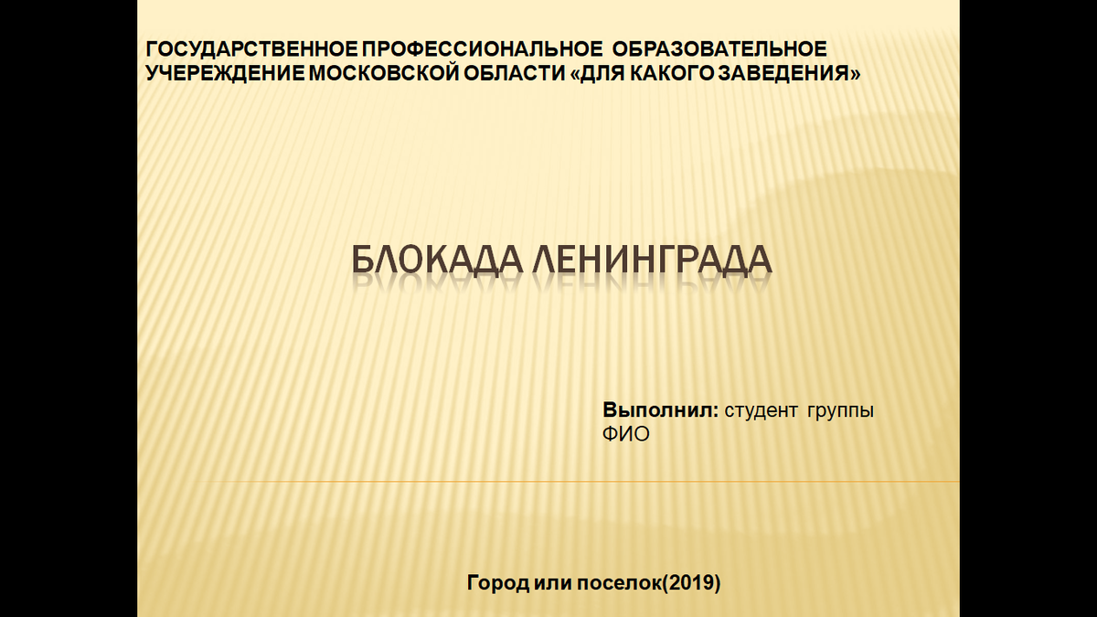 1. Для какого учреждения делается презентация. 2. Сама тема презентации. 3. Кто выполнил эту презентацию. 4. Город и год.