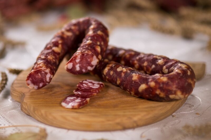 Хочу поделиться с Вами простым рецептом приготовления изумительной натуральной колбаски. Ингредиенты: 1,5 кг говядины 700 гр. шпика или свежего сала 3 ст. л. соли 0,5 ч. л. перца 2 ст. л. сахара 1,5 ст. водки 50 мл коньяка 1 ч. л. сухого чеснока оболочка для колбасы Приготовление: