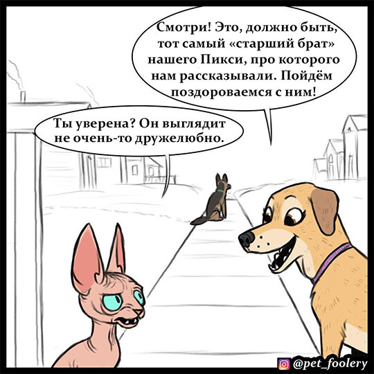 И снова мы рады поделиться с вами новой порцией замечательных комиксов о приключениях лысого кота Мистера Морщинки и собаки Лолы от художника Бена Хеда! Помните, мы рассказывали вам, что Лола и Мистер Морщинка существуют в той же Вселенной, что и герои другой серии - "Пикси и Брут"? Более того, они живут совсем рядом и в один прекрасный день решили познакомиться с новым соседом... Надеемся, что вам понравятся эти комиксы и наш перевод, сегодня мы подготовили для вас сразу две новые части! Читайте с самого начала здесь - ССЫЛКА Новый сосед Лучшие друзья Источник: instagram.com/pet_foolery/ Спасибо за просмотр, перевод новой части совсем скоро на нашем канале! Если вам понравилась эта статья, поставьте лайк и подпишитесь на канал, это очень помогает нам! А вот что ещё у нас есть: Лола и Мистер Морщинка - Часть 3 8 абсурдных комиксов для любителей нестандартного юмора Иллюстратор из Колумбии рисует милые и добрые комиксы, которые поднимут вам настроение