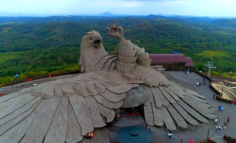 «Это не религиозный символ. Джатаю умер, защищая честь женщины и именно это означает скульптура. Люди всех верований инвестировали в проект и люди всех конфессий получат к нему доступ. Моя работа для всех, а для тех, кому нужна религия, есть старый храм за пределами комплекса», – объясняет свой замысел автор скульптуры Раджив Анчал. Впечатляюще масштабное произведение В сердце южного тропического штата Керала, Индия расположен туристический объект «Центр Земли Джатаю» (Jatayu Earth’s Centre). На 26 гектарах раскинулся живописный природный заповедник с четырьмя холмами, в котором развивается активный и экологичный туризм для любителей приключений. Захватывающие красоты тропиков можно совместить с интересными походами, преодолением крутых гор, увлекательным путешествиям по деревянным навесным мостам. Самая «свежая» туристическая достопримечательность в этом районе – это рекордная по размеру бетонная скульптура мифической птицы Джатаю. В соответствии с описанием в «Рамаяме», Jatayu – э