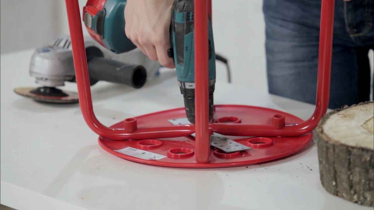 Как легко и быстро разнообразить внешний вид стандартных табуреток. С помощью шуруповёрта снять с табурета сиденье. Чтобы снять с табурета сиденье, можно воспользоваться подходящей отвёрткой. Отшлифовать спил дерева болгаркой или шлифовальной машиной. Прикрутить спил дерева к основанию табурета саморезами. Второй вариант табурета. Альпинистскую верёвку накрутить в спираль по размеру сиденья, закрепить степлером. На получившееся сиденье нанести универсальный клей. Приклеить новое сиденье к старому. Оставить до полного высыхания клея. Третий вариант табурета. Искусственную овечью шкуру перевернуть наизнанку и разложить на рабочей поверхности. На шкуру поставить табурет. На материале нанести разметку для будущего сиденья. Крупными стежками с изнаночной стороны закрепить шкуру к основанию табурета с помощью иголки и нитки. Табурет получается мягким и уютным.