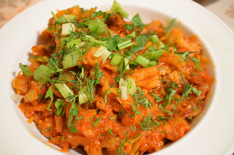 КБЖУ на 100 грамм блюда: Б - 6,1 г; Ж - 5,6 г; У - 7,1 г; 103 Ккал Ингредиенты: - филе куриного бедра - 380 г; - картофель - 300 г; - репчатый лук - 150 г; - томат - 120 г; - желтый перец - 120 г; - морковь - 100 г; - капуста - 350 г; - чеснок - 5 г; - томатная паста - 110 г; - растительное масло 50 мл; - черный перец по вкусу; - соль по вкусу; - паприка по вкусу. Для подачи: - свежая зелень по вкусу. Способ приготовления: Подготавливаем ингредиенты Подготавливаем все необходимые ингредиенты. Подготавливаем лук Лук моем, чистим, мелко шинкуем и обжариваем на растительном масле на "среднем" огне до небольшой золотистости. Подготавливаем морковь Морковь моем, чистим, натираем на крупной или средней терке, отправляем в сковороду к луку, перемешиваем и обжариваем в течение 2 минут. Подготавливаем чеснок Чеснок моем, чистим от шелухи, измельчаем прессом для чеснока или натираем на мелкой терке, добавляем к овощам, перемешиваем и обжариваем +- 1 минуту. Подготавливаем курицу Фил