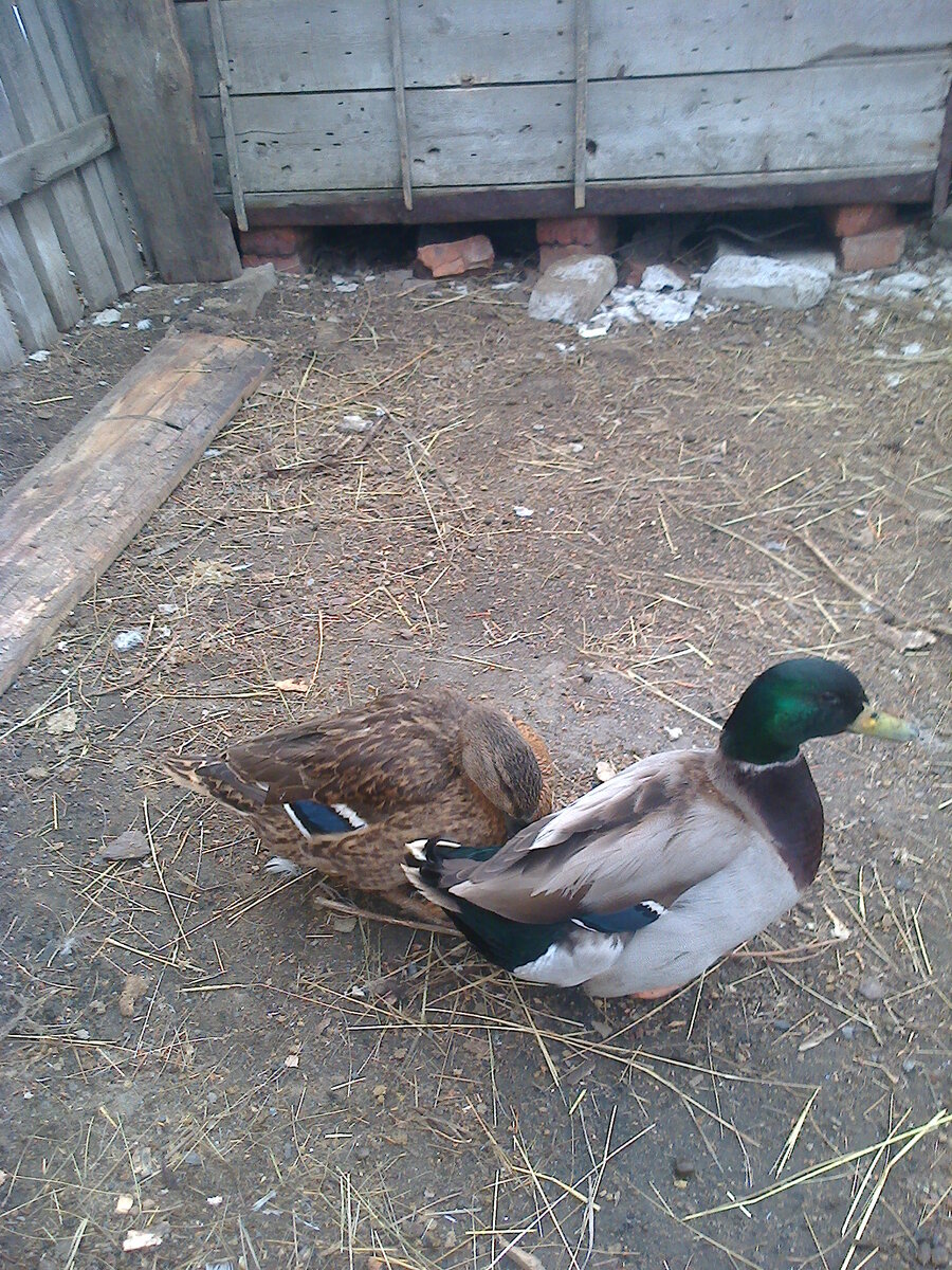 Приветствую вас читатели. В моем хозяйстве появились утки кряквы. Этих уток я увидела у знакомой. Во дворе купались 40 маленьких коричневых уточек. Среди них мелькали селезни в ярких изумрудных манишках. Размером они небольшие. Я в них влюбилась. И всю осень мечтала их купить для разведения. Осенью - в ноябре, я привезла уточек домой. Поселила их в клеточку в сарае. Зиму они перезимовали хорошо. В солнечные дни, я выпускала их на прогулку во двор. Это самая красивая парочка из всех уток. Селезень так ухаживает за своей крикливой подружкой, просто завидовать можно. Ни на шаг от нее не отходит. Вместе копаются в сене. Вместе гуляют по двору бок-о-бок. Он с отвагой нападает на большого гусака и защищает свою любимую. Весной с 15 марта уточка стала нести яйца. Через день или два утка садится в гнездо. Селезень сидит рядом и ждет, когда она снесет яйцо. Очень радуется, когда это происходит. Исполняет танец вокруг подружки. Они вместе бегут на улицу на прогулку. Эти уточки