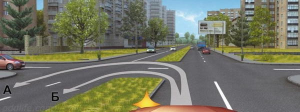 1. Только по А. 2. Только по Б. 3. По любой из указанных. Выполняя разворот на этом перекрестке, вам придется использовать для движения участок проезжей части, имеющий двустороннее движение. Поэтому, въезжая на перекресток, вы можете продолжить движение только по правой стороне этого участка проезжей части п. 1.4, т.е. по траектории А.