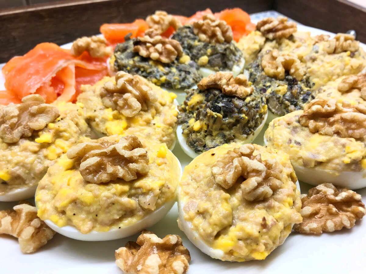 Скоро светлый праздник Пасхи, к которому, по обычаю, варят просто "тонны" яиц. Предлагаю сделать 3 очень простые и очень вкусные начинки для яиц на праздничный стол. Ингредиенты: Вареные яйца Печень трески Маринованная селедка Гриб портабелло (можно шампиньоны) Красный лук (можно и обычный) Майонез Грецкий орех (так же можно украсить зеленью) Начинка для яиц №1 Положите в пиалку печень трески и немного полейте маслом от печени, добавьте майонез и столько желтков, сколько яиц собираетесь начинить. Например, у меня 4 половинки белка и 4 половинки желтка. Соотношение желтков + майонез к печени - 1:1. Тщательно перемешайте вилкой, чтобы масса стала однородной. Начинка для яиц №2 Возьмите маринованную селедку и мелко-мелко нарежьте. Добавьте к ней желтки и майонез. Тщательно перемешайте до однородности. Начинка для яиц №3 Возьмите гриб портабелло (или шампиньоны) и мелко нарежьте. Также нарежьте красный лук. Разогрейте сковородку и добавьте немного подсолнечного масла. Обжарьте лук до золот