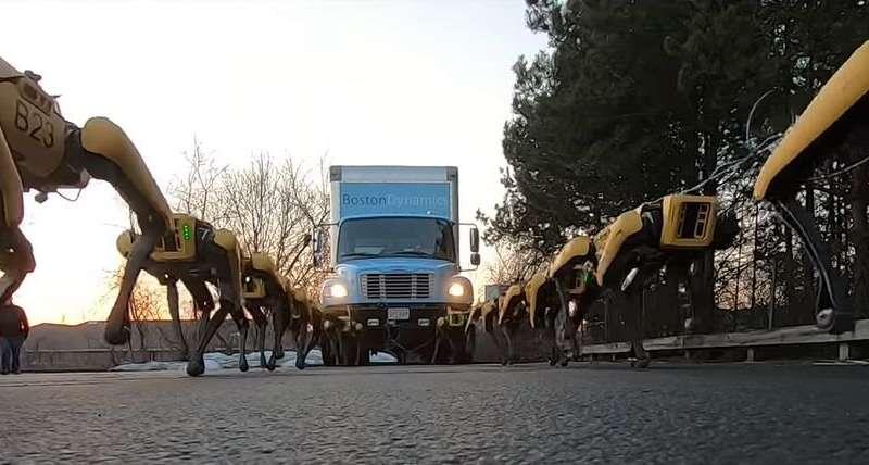 Североамериканская робототехническая фирма Boston Dynamics, что производит ряд разновидностей роботов, равно как двуногих, так и четвероногих. Все без исключения они предусмотрены для исполнения фактических задач, они благополучно преодолевают непростые преграды, выносят грузы и могут помочь людям в разных областях работы. С 2016 годы фирма трудится над четвероногим роботом SPOTMINI, с каждым годом они улучшают его возможности, ранее он обучился открывать дверь, захватывать и передвигать объекты весом вплоть до 14 кг., танцевать и запоминать маршруты. SPOTMINI функционирует от литиевого аккумулятора, 1-го заряда которого, в зависимости от задач, хватит приблизительно на 1.5 часа. Не так давно инженеры Boston Dynamics выявили новые способности следующего поколения SPOTMINI. Группу роботов возможно результативно применять в свойстве гужевой мощи, на фотографии 10 маленьких агрегатов тянут автомобиль на нейтральной передаче в горку с уклоном рельефа местности приблизительно в 1 градус.
