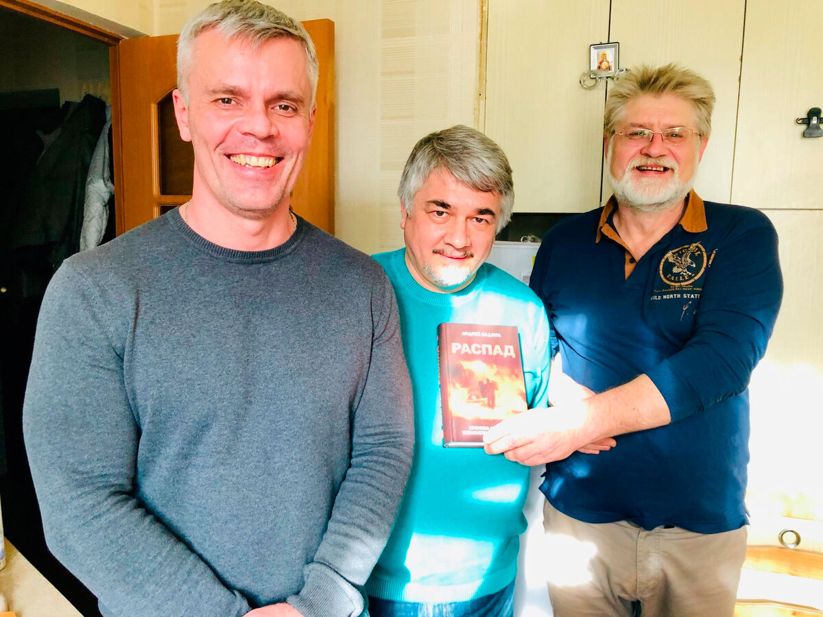 Встретился с Андреем Ваджрой (слева) и Ростиславом Ищенко (в центре). Андрей подарил нам по своей книжке. Книжка очень увесистая и очень интересная — она о том, как Украина дошла до жизни такой и почему не могло быть иначе.