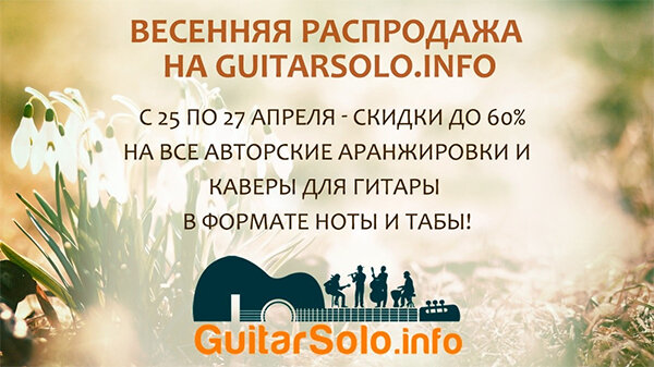 Ноты и Табы для гитары популярной, классической и авторской музыки со скидками до 60%. Только с 25 по 27 апреля! Здравствуйте, Любители Гитары! У нас хорошая весенняя новость! С 25 по 27 апреля состоится глобальная весенняя распродажа авторских аранжировок и каверов на GuitarSolo.info Это хороший шанс приобрести лучшие авторские гитарные аранжировки и каверы в свою коллекцию. Следующая распродажа будет только перед новым годом, так что не упускайте возможность пополнить свой репертуар! PS. Обратите внимание, что у нас появились бесплатные авторские аранжировки и с четверга появится новый раздел “Обучение”. ПОСМОТРЕТЬ ПРЕДЛОЖЕНИЯ С уважением, Команда GuitarSolo.info