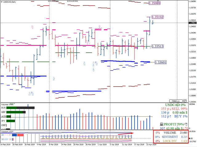 Перевес бычьих позиций при этом увеличился на 16%. В денежном эквиваленте перевес покупателей составил $8 млрд 215 млн. За предыдущую неделю инвесторы увеличили количество залокированных позиций менее чем на 1%. Это дает основания предполагать о вероятном однонаправленном движении котировок актива на дневном таймфрейме на протяжении второй половины текущей торговой недели. Также стоит отметить следующее отношение вложений капитала в деривативы на USD/CAD среди SMART MONEY: 67% покупателей и 33% продавцов. Ближайшим долгосрочным уровнем поддержки на дневном таймфрейме выступает месячный опционный уровень баланса маркетмейкера, который размещен по ценовой отметке 1.3351.