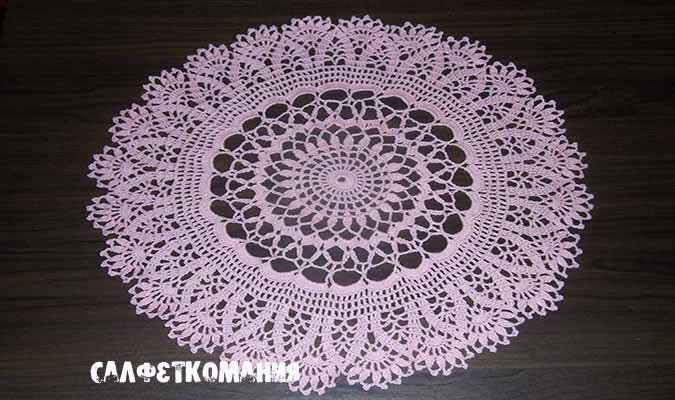 Здравствуйте, дорогие рукодельницы! Хочу показать вам интересную красивую салфетку крючком, связанную собственноручно. Ее диаметр 33 см. Я много видела таких салфеточек, выполненных в разном цвете и даже с использованием нескольких цветов в одной. Она выглядит во всех случаях великолепно. Для вязания я выбрала нитки «Роза» (50 г /320 м, мерсеризованный хлопок). Они такого бледного нежного розового цвета. Ниточки тоненькие, ровные и жесткие, люблю из них салфетки вязать. Готовые работы не нуждаются в подкрахмаливании, потому что прекрасно держат форму. Подходящий номер крючка – 0,9. Видео я тоже снимала, только еще училась делать мк, может быть не все хорошо и понятно для начинающих. Критические замечания принимаются! Видео мк по вязанию розовой салфетки Схема красивой розовой салфетки Схема не трудная, условные обозначения, надеюсь, понятные – это столбики с одним накидом и с двумя, провязанные вместе. В последнем ряду между столбиками элементы с пико. Легких вам петелек! Подписывайте