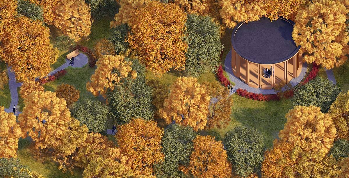 Сцена: будет установлена сцена-ракушка с рядами для зрителей, вокруг деревьев предлагается установить круговые лавки.
