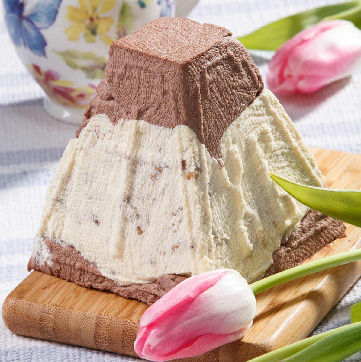 1 л сливок 4 стакана сметаны 10 яиц пол стакана сахара 100 г очищенных орехов 100 г цукатов ванилин цедра лимона или апельсина кардамон по вкусу Яйца взбить со сметаной, развести сливками, хорошо перемешать, вылить в кастрюлю и поставить кипятить, постоянно перемешивая. Когда появится сыворотка, перелить в полотняную салфетку, поставить в холоднле место и дать сыворотке стечь. После чего переложить в миску, добавить сахар, ванилин, тщательно перемешать. Можно добавить очищенные, мелко накрошенные орехи, цукаты, кардамон, лимонную или апельсиновую цедру. Подготовленный творог выложить в форму и поставить под пресс, как и обыкновенную пасху.