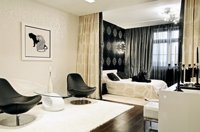 Пример зонирования комнаты на гостиную и спальню с помощью занавеса