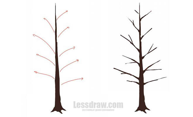 Практически всегда в рисовании любого пейзажа в качестве основного или дополнительного объекта фигурирует дерево, а иногда даже не одно. Прежде чем взяться за рисование целой рощи или даже леса, нужно научиться рисовать одиночное дерево, а также потренироваться в рисовании деревьев разных типов. этом уроке я хочу продемонстрировать, как нарисовать деревья разных видов красками, используя разные техники. Очень важно, чтобы краски были хорошего качества. Использование некачественных красок приведет к тому, что вам будет сложно контролировать работу с краской, да и вообще весь процесс не принесет много удовольствия, а результат, скорее всего, будет крайне посредственным. Итак, я покажу, как нарисовать зимнюю ель красками, лиственное дерево, а также технику рисования дерева при помощи губки. Давайте начнем. Как нарисовать ель красками Для начала обозначим ствол. От него показано, в каком направлении растут побочные ветки. Важно – если вы рисуете не гуашью, а акварелью, тогда нужно буде