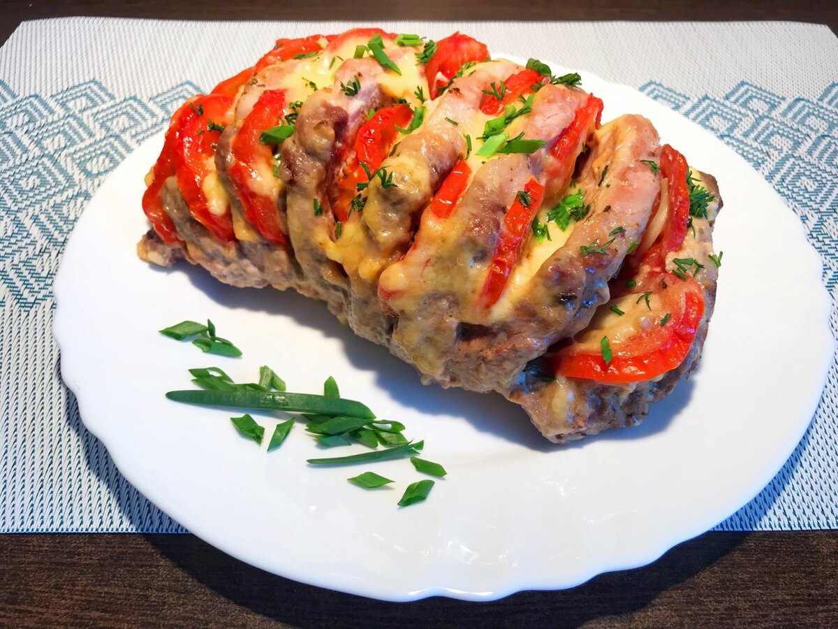 В каждый надрез мяса укладываем пару пластинок чеснока, сыр и два кружочка помидора.
