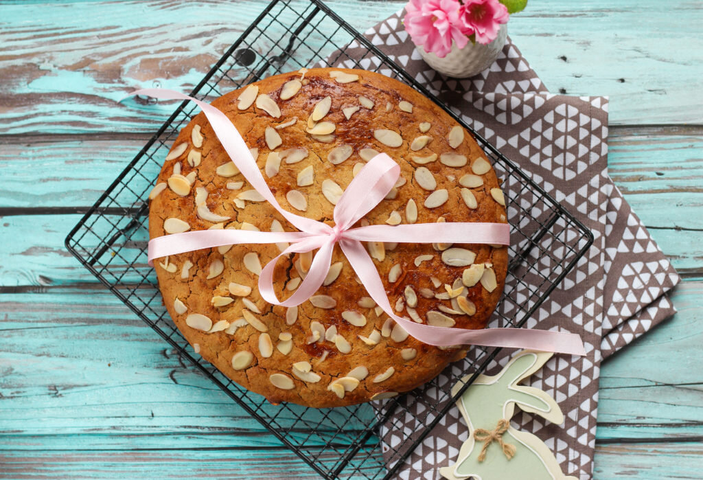Я не использую никаких безглютеновых смесей, я люблю натуральную безглютеновую муку. Работать с ними немного сложнее, но результат того стоит. И с наступлением Пасхи я приготовил для вас здоровый безглютеновый торт. ингредиенты: 150 г гречневой муки 150 г муки пшена 50 г тертого кокоса 2 целых яйца 200 мл теплого молока (я использовал миндаль) 120 г растворенного масла 3 столовые ложки меда 1 БИО ванильный сахар 25 г свежих дрожжей 1 чайная ложка тертой цедры лимона горсть изюма (предварительно пропитанная амареттой или ромом) щепотка соли миндальные хлопья Приготовление: В небольшой миске размешайте 2 столовые ложки молока, 1 чайную ложку меда, 1 столовую ложку гречневой муки, 25 г дрожжей и дайте закваске подняться. В миске размешайте одно целое яйцо одним желтком, тремя столовыми ложками меда и ванильным сахаром. Добавьте топленое масло, теплое молоко, цедру лимона и закваску. Размешайте в смеси постепенно гречневую и пшенную муку, тертый кокос, изюм и щепотку соли. Вручную