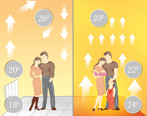 Обогрев помещений все время будет главной проблемой при возведении жилища. Существующие сегодня системы обогрева не могут обеспечить равномерный нагрев всего помещения. Нагретый воздух всегда поднимается вверх к потолку, а охлажденный – опускается вниз на пол. Но, когда на пол уложен камень или плитка, он в холодное время будет отдавать холодом. Чтобы выйти из создавшегося положения, устанавливают отопление, которое называют комбинированным. Оно представляет собой использование отопительных радиаторов и пола с подогревом. Сейчас обустройство пола с подогревом производится по двум схемам, они в принципе совсем разные по устройству и установке. Электрические системы пол нагревают специальным кабелем или пленкой. При их монтаже устанавливают терморегулятор и таймер. Ими регулируют температуру нагрева пола.