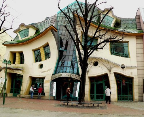 Кривой дом расположен на улице Героев Монте-Кассино в Польском городе Сопот . Пешеходная улица, именуемая горожанами как Монтяк, излюбленное место не только среди туристов, но и среди местных жителей в Польше, так как с неё открывается чудесный вид на город и его старинные дома. Архитектурный проект дома был разработан знаменитым польским архитектором Яном Мартином Сзенсером, который также широко известен в Польше своими иллюстрациями к детским книжкам, и Пером Далбергом, шведским художником, живущим в Сопоте. В кривом доме нет ни одного прямого угла. Крыша, стены, окна и двери изгибаются так, будто вы смотрите на него через искажающую оптику. Именно поэтому дом выглядит очень нереальным и сказочным. Оригинальности ему еще добавляет необычная чешуйчатая крыша, сделанная из железных листов с эмалированными пластинами-вставками. В кривом доме, который является торговым комплексом, кривым сделали только фасад. Задуман, таким неординарным, он был с целью привлечения посети