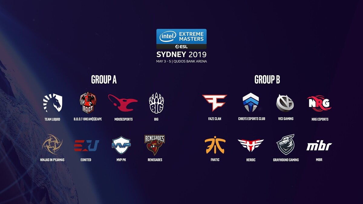 Были оглашены группы на предстоящий IEM Sydney 2019 Информация по турниру: Пройдёт мероприятие с 30 апреля по 5 мая этого года в Австралии, Сидней Призовой фонд: 250 000$ Формат проведения: Двойная сетка в групповой стадии (GSL) и одиночная сетка в плей-оффе. Все первые матчи в групповой стадии BO1, далее BO3 вплоть до самого гранд-финала, в котором формат матча уже будет BO5 Участвующие команды: FaZe, Liquid, mousesports, MiBR, NiP, Renegades, NRG, Heroic, Chief, Grayhound, fnatic, BIG, eUnited, ViCi, MVP, B.O.O.T-d[S].