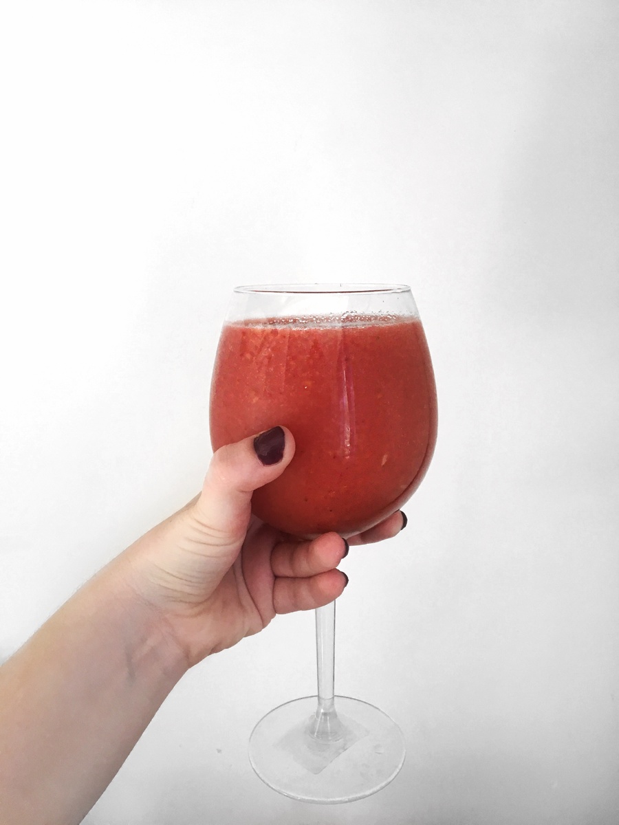 Сму́зи (от англ. smoothie, происходящего из англ. smooth — «однородный, мягкий, приятный») — густой напиток в виде смешанных в блендере или миксере ягод, фруктов или овощей (обычно одного вида) с добавлением молока, сока, льда, мороженого и тд. 50 грамм замороженной клубники, 1/2 манго , 300 мл. Воды Добавляем в блендер клубнику и измельчаем ее. Добавляем к клубнике манго. Смешиваем. Вливаем в смузи воду. Напиток получился около 500 мл- 110 ккал.