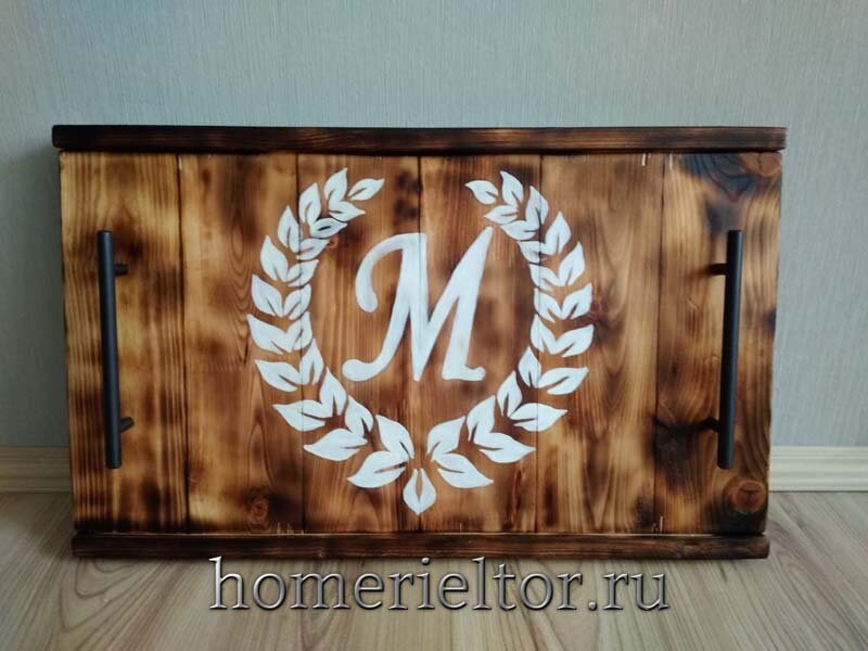 6 дощечек толщиной 25 мм длиной 32 см и шириной 10 см соединяем шип в паз и скрепляем между собой двумя брусками 20×30 мм через саморез в каждую доску. Делаем обжиг поверхности древесины строительным феном или паяльной лампой: Для придания уникальности изделию наносим монограмму с виньетками. Чтобы перенести изображение на тёмный фон, нужно на оборотную сторону листа нанести мел, закрепить изображение на поверхность изделия и прорисовать все линии карандашом или ручкой. Аккуратно прорисовываем рисунок белой краской, можно в несколько слоёв. Покрываем лаком на водной основе. Прикрепляем ручки. Готовый результат 60 см x 32 см: