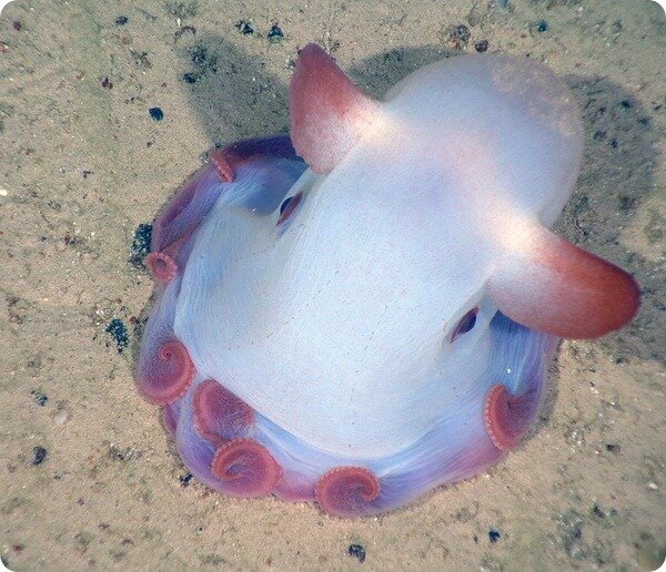 Гримпотевтис (лат. Grimpoteuthis), является глубоководным жителем, обитающим на глубине от 100 до 5.000 метров, хотя некоторые виды были обнаружены на глубине 7.000 метров. Это самая глубокая точка для глубоководных моллюсков. Известно, что в природе существует порядка 37 всевозможных разновидностей осьминогов Думбо, классифицированные на 4 семейства, которые, как правило, обитают в непосредственной близости от океанического дна. Осьминоги, достигшие зрелого возраста, достигают 20 см в длину. По сравнению с другими моллюсками, осьминог Думбо представляет собой удивительную разновидность семейства осьминогов, так как он предпочитает заглатывать пойманную добычу целиком. Разновидности осьминога Думбо, обитающие на дне, питаются, в основном, ракообразными, червеобразными животными и двустворчатыми моллюсками. Пелагические же веслоногие ракообразные составляют рацион той разновидности осьминогов, которые обитают на значительном расстоянии от океанического дна. Осьминог Думбо – это мягк