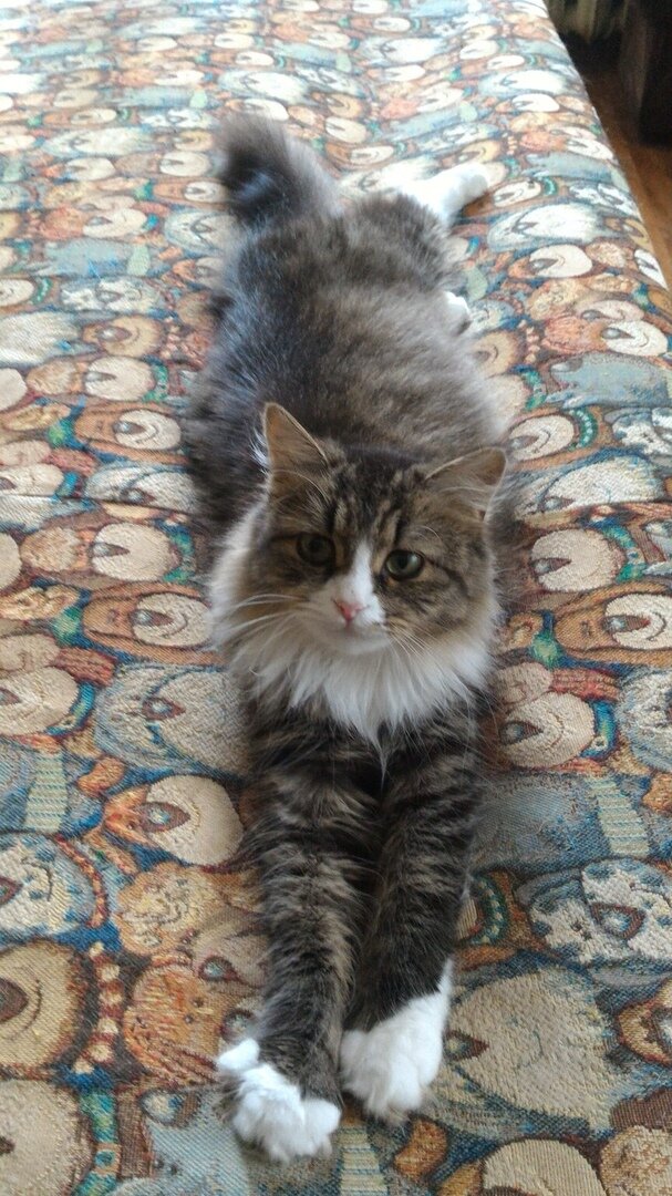 Говорят, что на "рынке пристройства" такие вот "шпротики" очень даже востребованы, что такого серого полосатика вполне реально пристроить. Однако, то ли таких вот полосатиков пруд пруди, то ли кошка у нас какая-то несчастливая, только за этот год, что провела у нас Марьяша, никто не обратил на неё внимания. Ни одного звонка. А кошка-то, если присмотреться, роскошная. Один огромный пушистый хвост чего стоит! А зеленые глазищи! Да все в ней прекрасно, и внешность, и характер. С людьми ласкова, но ненавязчива. Запросто найдет, чем ей заняться. Просто обожает собак. Подойдет, потрется, помурлычет, хвостом по морде пройдется)) И собаки её любят. Наверное за то, что никогда не наглеет и не дразнит.