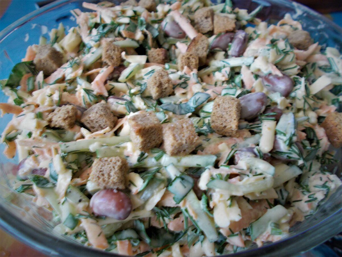 Нам понадобится 1 большая морковь 2 средних огурца 150 г сыра 1 банка консервированной фасоли 1 пучек петрушки 1 пучек укропа 4-5 зубчиков чеснока 4-5 столовых ложек маойнеза 1 большая пачка сухариков морковь и сыр натереть на крупной терке, огурец порезать тонкой соломкой, зелень измельчить, фасоль промыть в проточной воде, чеснок пропустить через пресс Все смешать с майонезом, посолить поперчить. сухарики замешать в салат перед подачей чтоб они не размокли. Салат готов! Кушайте с удовольствием:)