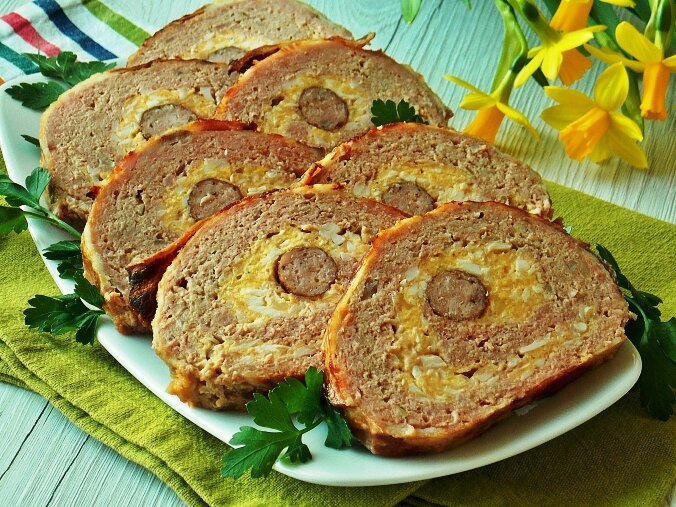 Мясной рулет из свинины, рецепт которого я предлагаю на этой странице – это шикарное мясное блюдо на Пасху. Готовится рулет из рубленого мяса, с начинкой из яиц и копченой колбаски, все это обернуто копченым беконом, который придает рулету характерный вкус, а также делает блюдо сочным и мягким, не давая вытекать сокам из мяса. Мясной рулет из свинины в духовке – очень вкусное, ароматное, красивое блюдо. Вам понравится нежное, мягкое и сочное мясо с ароматом чеснока, хрена и копченостей. Кусочки рулета из мяса свинины с начинкой выглядят празднично, не разваливаются во время нарезки, а готовится это блюдо совсем не сложно. Рекомендую! ИНГРЕДИЕНТЫ Для мясной смеси: 1 кг фарша из лопатки свинины; 2 яйца; 2 ломтика белого хлеба; молоко для замачивания хлеба; 2 зубчика чеснока; 1 луковица; 1 ст. ложка томатной пасты; 1 ч. ложка паприки молотой; 1 ч. ложка соли; перец черный – по вкусу; 300 г копченого бекона. Для яичной начинки: 5 яиц; 100 г твердого сыра; 1 ст. ложка майонеза; 1 ст. лож