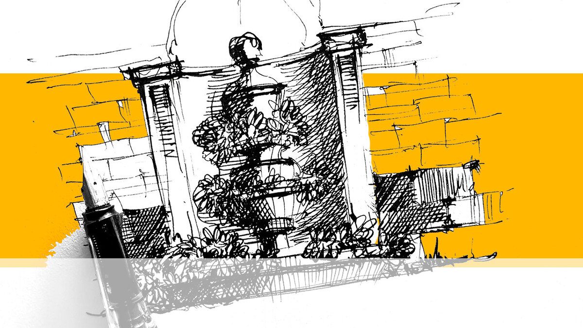 Новый набросок для ландшафтного дизайна сада - композиция из вазы и фонтана у стены. Для такого быстрого рисунка использую перьевую ручку Lamy, и альбом для набросков с простой бумагой. Видео рисования в деталях смотрите в конце статьи. А по этапам примерно так : Начинаю рисовать от пересечения линий - вертикали и горизонтали. Так как композиция симметричная, то вертикальная центральная линия - это то, от чего я отталкиваюсь в рисовании этой картинки постоянно. Намечаю примерные формы чаш фонтана. Примерно примеряюсь к размерам вазы. Основа готова - я нарисовал главные формы - теперь нет проблемы дорисовать формы зелени. Зелень я рисую в чашах - потому, что скорее всего воду туда проводить не будут - возможно все ограничится растительностью. Добавляю к рисунку идею формообразования стены - в классическом эффектном стиле. Немного расширяю нижнюю чашу фонтана и размечаю стену под грубый камень и кирпич. закрепляю и поддерживаю этим пропорциональные соотношения в дизайне. Что б