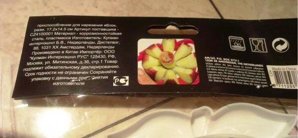 Увидела рекламу яблокорезки - вот так бывает: посмотрела, запомнилось и засело в голове - хочу такую же! вот, наконец, нашла я в Ашане Свою яблокорезку. Лежала она на полке среди всяких других "полезных" мелочей, где все по 69руб. Совсем недорого и выбросить не жалко если окажется очередной ерундой.)) Приспособление для нарезания яблок выполнено из пластмассы и стойкой к коррозиям стали. Изготовитель - Нидерланды, ну а произведено, естественно, в Китае. Конструкция представляет собой систему заточенных пластин, собранных в виде солнышка и оправленных в пластик, по форме напоминающий яблоко. Для удобства пользователя есть выступающие ручки. Дальше все просто и понятно: размещаем яблоко на плоской поверхности, лучше, если это будет разделочная доска, совмещаем центр приспособления с углублением (хвостиком) яблока, надавливаем на ручки и наш фрукт распадается на 8 равных частей - не всегда это получается легким нажатием, зависит от жесткости яблока. Выглядит эстетично, съедается бы