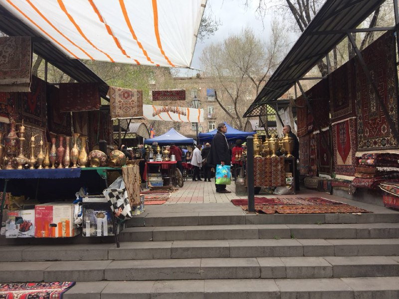 Как я и думала: Вернисаж в Ереване -это не блошиный, а просто рынок. Миллион киосков с украшениями, шахматами, коврами-все одинаковое и не сильно интересное. Продавцы сидят и скучают, но вроде как с удовольствием торгуются. Встречаются лотки со старой посудой и фарфором и несмотря на то, что все в принципе недорого, кажется, что тебя все-таки хотят наколоть. В основном, там можно найти сувениры (говорят, что тут дешевле, чем где-либо по городу) - всякие страшные куклы в национальных костюмах и, например, деревянный держатель для очков в форме носа (вот такая диковинка-сувенир для близоруких друзей) По окраинам рынка разместились бабушки-дедушки, которые торгуют старой посудой, вот там реально можно что-то найти стоящее Например, этот сервиз стоил примерно тыщу, но у меня же хрупкие плечи и рюкзак, куда мне столько А ещё там до фига серебра, я в нем ниче не понимаю, вроде как сейчас и пробы подделывают, но вот купила себе такие гигантские серьги-шары. Тётенька показалась мне н