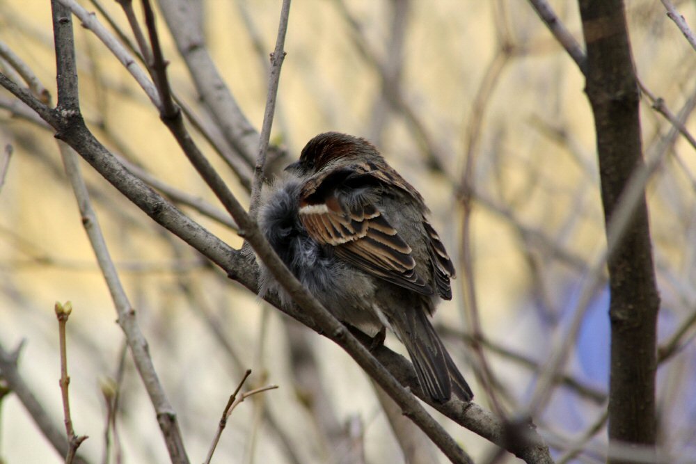 Фотографировать птиц в лесу или в поле очень сложно. Птицы осторожны, подпускают к себе на расстояние взгляда. Человек с фотоаппаратом видит птицу, но и птица видит фотографа, и в тоже мгновение скрывается в густых ветвях куста или дерева. Другое дело город. Людей здесь много, они бродят туда-сюда, птицы к этому привыкают, не шарахаются, не прячутся от каждого движения идущего мимо человека. В городе фотографировать птиц намного проще. Недавно фотографировал птиц в Губернаторском парке (бывший парк Пионеров). Преимущество этого парка: деревья стоят редко, много света, много открытого пространства. Птицам особо спрятаться негде, все они на виду. Вот воробей - из-за порыва сильного холодного ветра не замечает, что творится вокруг. Перья взъерошены, лапки судорожно вцепились в ветку. Белая трясогузка бегает по земле, ей ветер не страшен, но птица очень подвижная, фотографировать ее все-равно не просто. В книгах пишут, что снегири на лето улетают в лес. Тот снегирь, что попался мне, похо