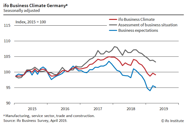Масло в огонь подлил институт CES IFO, опубликовавший 24 апреля результаты исследования настроений немецкого бизнеса. Согласно оценке IFO Индекс делового климата упал с 99,7 пункта (с учетом сезонных колебаний) в марте до 99,2 пункта в апреле. Компании были менее удовлетворены своей текущей деловой ситуацией. Мягкий мартовский оптимизм в отношении предстоящих месяцев испарился. Деловой климат в производственном секторе снова заметно ухудшился. Загрузка производственных мощностей снизилась на 0,8 процентного пункта до 85,4 процента. В сфере услуг индекс немного вырос из-за более оптимистичных ожиданий.В торговле деловой климат также несколько ухудшился, а в строительстве наоборот вырос (рис.1).