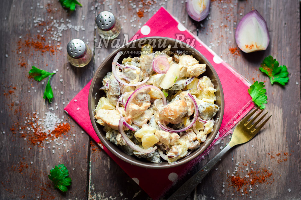 Продукты: - картофель отварной – 2 шт., - куриное филе – 200 гр., - шампиньоны – 6-8 шт., - лук красный – 1 шт., - маринованные огурцы – 5 шт., - соль, перец – по вкусу, - масло растительное – 2 ст.л., - майонез – 1 ст.л. 🔪Лук разделить пополам, одну часть оставляем в сыром виде, другую поджарим, нарезаем полукольцами 🥔Отваренный картофель и огурцы нарезать кубиками, добавить сырой лук 🍄В сковороде с маслом поджарить порезанное кубиками мясо и грибы, а также вторую половину лука 🧂Смешать все ингредиенты, добавив майонез, соль и перец https://namenu.ru/11144/Salat_Derevenskij_s_ogurcami_i_shampinqonami/