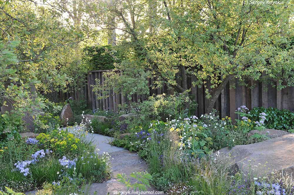 На Цветочном Шоу в Челси – 2016 впервые вручали награду за наилучшее воплощение сада. Победил подрядчик, собиравший M&G Garden дизайнера Клива Веста - Swatton Landscape. Заслуженно! Потрясающая работа с камнем и водой, изящные мелкофактурные цветники под развесистыми дубами, даже игра света и тени – все было продумано и реализовано в мельчайших деталях. Впрочем, и сам Клив Вест претендовал на лучший шоу-гарден и в итоге получил золотую медаль. Для Клива Веста этот сад стал очень личной работой. Это воспоминание о местах, где прошли его детство и юность, о лесах, болотах и морских скалах Эксмура. Через весь сад бежит мощеная тропинка - мимо каменных глыб, в чашах которых скопилась дождевая вода (какие поилки для птиц!) к нарочито рукотворной, «дизайнерской» площадке из такого же, как сама дорожка, камня. По мере продвижения вглубь сада меняется материал мощения – необработанный булыжник переходит в пиленый камень, а затем – в полированную поверхность площадки. Этот пут