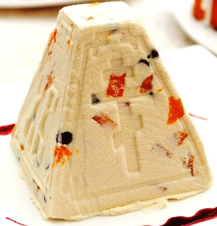 Ингредиенты: -Творог жирный (чем выше жирность - тем лучше) – 1 кг. -Пудра сахарная – 200 гр. - Масло сливочное – 200 гр. - Изюм (по желанию) – 1 ст.л. - Ванилин (по желанию) – щепотка - Сливки жирные (чем выше жирность - тем лучше) – 300 мл. - Яйца -8 штук - Цукаты -200 гр. - Кардамон ( по желанию)- щепотка Сначала нужно отжать творог от лишней влаги. Отжатый творог выкладываем в кастрюлю (лучше, если с толстым дном). Добавляем размягченное сливочное масло и сливки. Всё растираем и хорошенечко перемешиваем. Ставим кастрюлю на водяную баню. Доводим творожную массу до кипения, но не кипятим. Желтки растираем с сахарной пудрой и добавляем в творожную массу. Продолжаем помешивать. Далее добавляем оставшуюся сахарную пудру, по щепотке ванилина и кардамона. Всю массу продолжаем нагревать на водяной бане, мешаем, примерно 30 минут. После добавляем порезанные цукаты и изюм. И держим на водяной бане, помешивая, около 10 минут. Пасочницу или форму застилаем