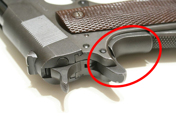 Кольт М1911 — один из самых известных пистолетов. Это оружие является таким же долгожителем, как и не менее знаменитые автоматы Калашникова. Однако, несмотря на то что многие имеют представление о внешнем виде этого пистолета, Кольт все-таки способен удивить своими интересными конструкторскими решениями. Итак, на повестке дня загадочная кнопка на рукоятке М1911. Возможно вы удивитесь, но эта деталь ни что иное, как предохранитель. Но не привычный нам флажковый (который, к слову, над красненьким кружочком), а автоматический. Такой предохранитель не требует никаких действий от стрелка — это "пассивная" защита от случайных выстрелов, например, в кармане. Проще говоря, автоматический предохранитель в М1911 представляет собой выступающую над поверхностью рукоятки кнопку. Он постоянно находится во включенном состоянии и выключаются только при правильном охвате рукоятки пистолета рукой владельца. Занимательно так же и то, что для "снятия" с предохранителя нужно приложить силу в противополож